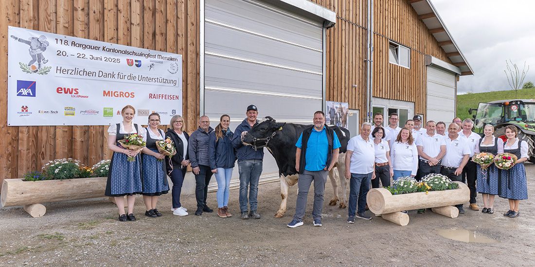 Der Sieger des 118. Aargauer Kantonalschwingfestes 2025 darf sich auf einen prächtigen Siegerpreis freuen. Holstein-Zuchtstier Menzo wurde auf dem Menziker Kasernhof im Beisein der Besitzer Salome und Sämi Stadler, den Lebendpreisspendern Mario und Sonja Schlatter von der Firma Rudolf Maurer AG Gontenschwil getauft. Götti ist Josef Bergmann, ehemaliger eidgenössischer Kranzschwinger und Ehrenmitglied des Schwingklubs Kreis Kulm. Bergmann der heute in Ingenbohl im Kanton Schwyz lebt, konnte die beiden Aargauer Kantonalschwingfeste 1992 und 1993 für sich entscheiden. Ebenfalls getauft wurde Rind Mogli (Spenderin Patrizia Siegrist, Mogli Mode, Accessoires, Geschenke, Reinach) aus dem Stall von Urs Siegrist vom Berghof im Menziker Ortsteil Burg. Über diesen prächtigen Naturalpreis darf sich der Drittplatzierte des Kantonalschwingfestes freuen. Die Taufe von Fohlen Evana vom Homberg (Spenderin Metzgerei Ulmann Zetzwil) aus der Zucht von Bernadette Hediger aus Reinach für den zweitplatzierten Schwinger fand bereits im März statt. Und zwar im Jura, wo das Fohlen aktuell auf sein Leben vorbereitet wurde. Selbstverständlich gehen auch alle anderen klassierten Schwinger des 118. Aargauer Kantonalen nicht mit leeren Händen nach Hause. Der Gabentempel ist prall gefüllt mit wunderschönen Preisen. Die Auswahl reicht dabei von der Glocke über das geschnitzte Möbel, Motorgeräte, Markenvelos, Markenskis, Markengrill etc., bis hin zur exklusiven Uhr.